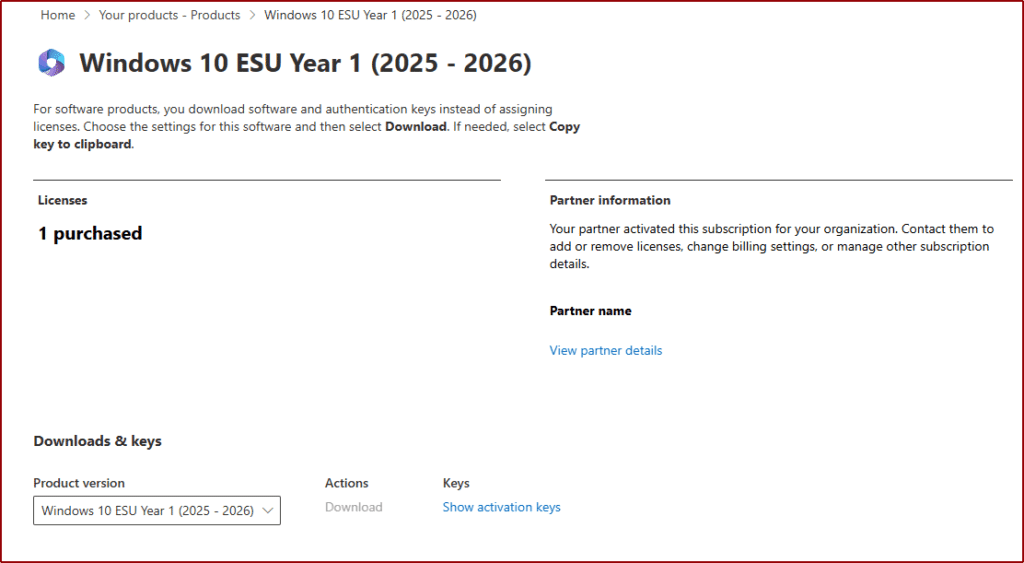 Well, if you, like me, are on the commercial side of Windows (Entra or On Prem AD joined, Hybrid or MDM managed) you will need to pay for that extra support. On my case, (and for the remainder of this post) I bought a license from my CSP (Cloud Solution Provider), and then once the process went through, I could see this on my Admin Portal.