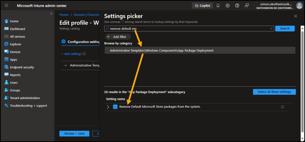 I will create a Windows configuration policy based on the Settings Catalog. The settings I need for this are easily found by searching for “Remove Default Microsoft Store”.