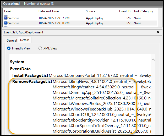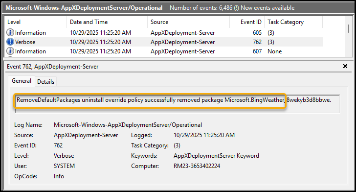 Looking at the AppXDeployment log, we can also see a list of all applications that were removed.