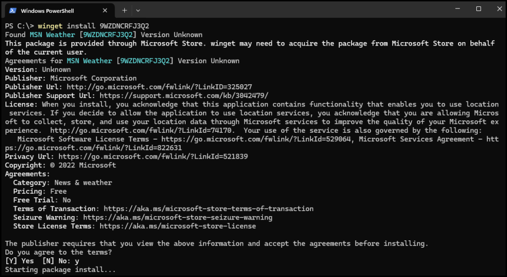 It’s unlikely that end users will try to install apps using Winget in PowerShell. Let’s therefore test the Microsoft Store instead. Searching the “MSN Weather” app, I find the app and can click the install button.