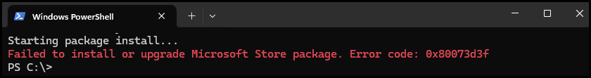This results in an error message: Failed to install or upgrade Microsoft Store package. Error code: 0x80073d3f.