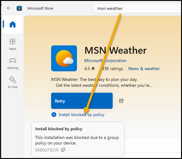 Attempts to reinstall removed apps, whether via Winget or the Microsoft Store, are blocked by policy. (error code 0x80073D3F)