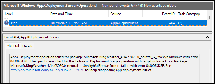 To confirm how the policy behaves, it’s worth checking the Event Viewer for traces of app install block. In the AppXDeployment-Server log we checked earlier, I will now find a 404 event id with the same error code 0x80073D3F: