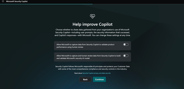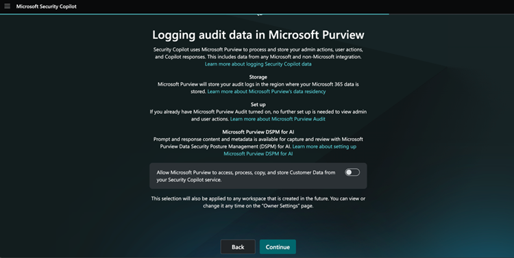This next screen is a newer part of the setup flow. All it is doing is asking whether you want Security Copilot activity to be logged and stored in Microsoft Purview Audit, which is the same place Microsoft 365 already stores your audit logs.