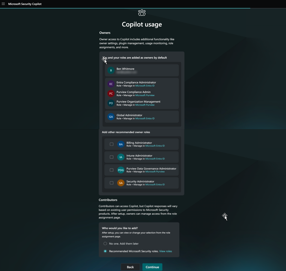 The lower section covers Contributors. Contributors can use Copilot, but their experience depends entirely on the permissions they already have across Microsoft Security products. Copilot will never give someone more access than they already hold elsewhere. You can choose to add contributors now or skip it and configure them later.
