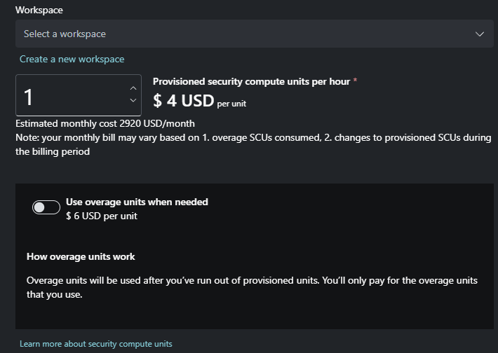 The Provisioned security compute units per hour box in the image above is your always-on compute. Azure will not let you go below one, because Copilot needs at least one SCU to function. You pay for this every hour, whether Copilot is doing anything or not.