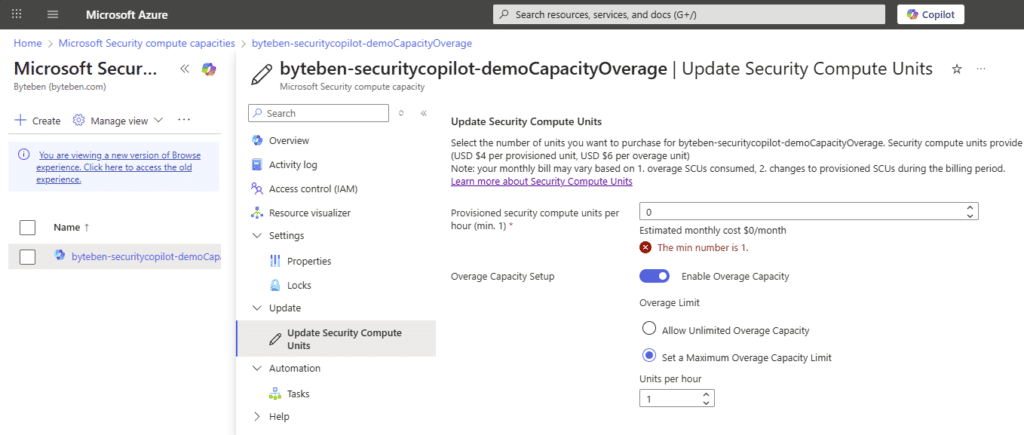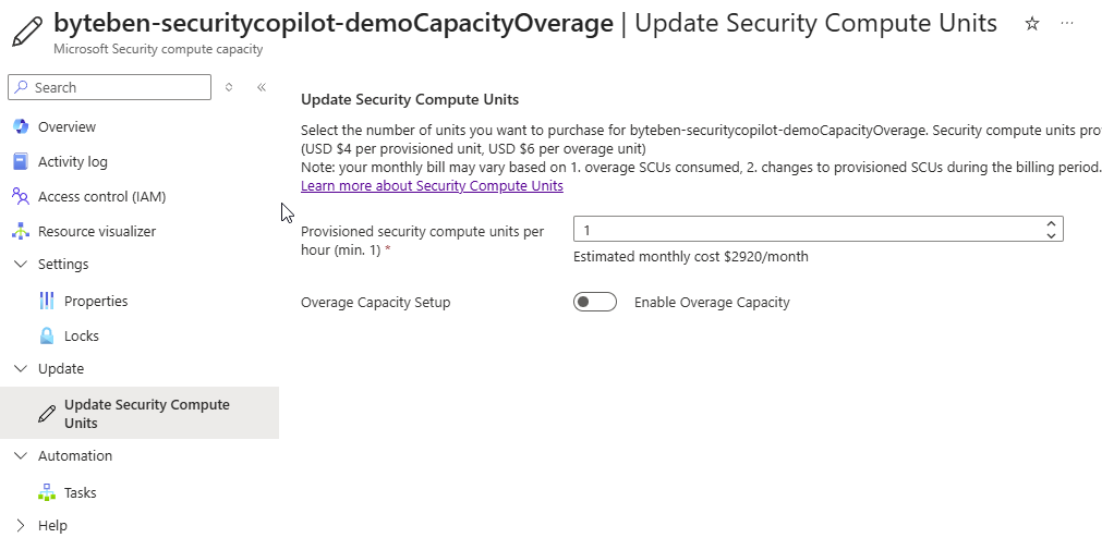 What you are looking at here is the Azure Security Compute Capacity resource, the same rotating kebab grill that keeps Security Copilot cooking. This is where you tell Azure how much compute you want to keep warmed up every hour, and how much extra Copilot is allowed to grab (overage) when things get busy.