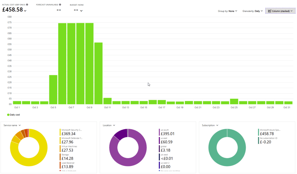 You can see from the chart that I enabled Security Copilot on Sunday (no rest for the wicked) 5th of October, in the afternoon, so I did not get hit with the full 24 hour charge on day one. This is what 1SCU at $4 per hour actually looks like in UK money. It works out to roughly £73 per day. For 1 SCU. Doing absolutely nothing while you sleep.