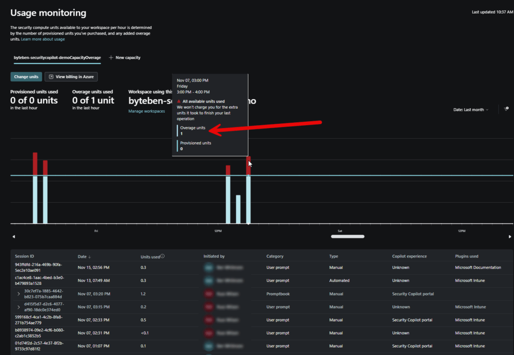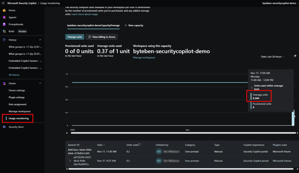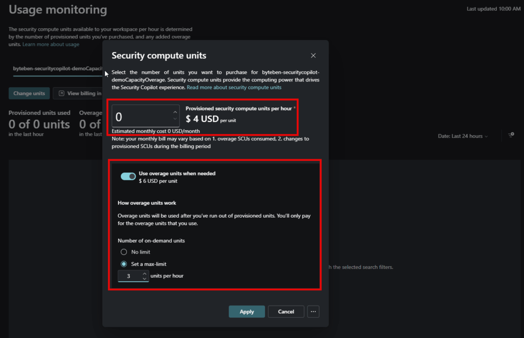 Even though the Azure portal forces you to enter a minimum of 1 SCU when you are editing the capacity there, the standalone Security Copilot portal actually lets you set your provisioned SCUs to 0 and run entirely on overage instead. This works more like a pay-as-you-go model. Overage costs more per hour, so you pay a higher rate when you use Copilot, but you avoid the fixed daily commitment of $96 (for 1 SCU). There are some limitations when you rely on overage only, and we will touch on those later.