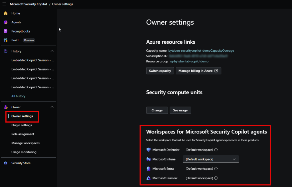 Not to be overlooked quickly is the owner settings blade. Here you can choose which workspace each product’s built-in Copilot experience should use.