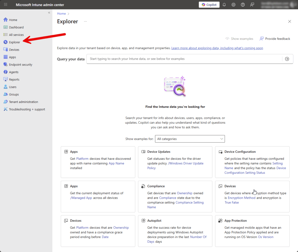 Explorer is one of those embedded Copilot experiences I mentioned that lights up when you enable Security Copilot. At first glance, it looks like you use a natural language search box where you can ask questions about your Intune data. The interface shows you a bunch of pre-written example queries to get you started, things like finding devices with a specific app installed or checking compliance states for particular settings.