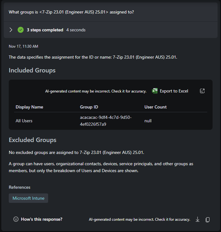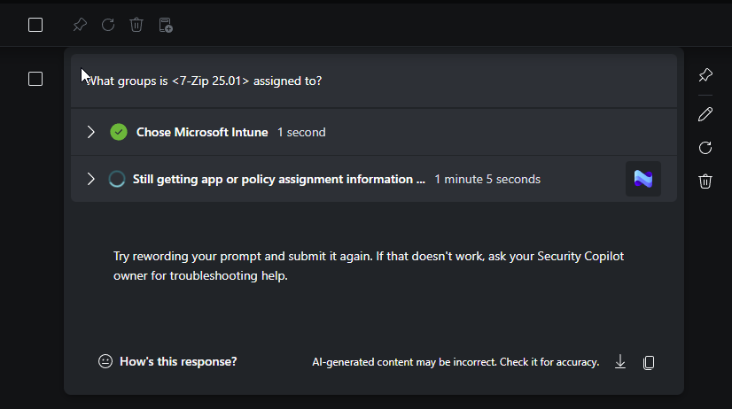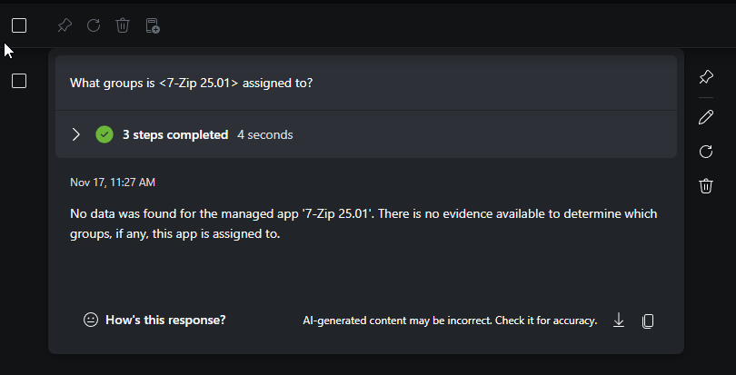 When you move past Explorer and start clicking the actual Copilot buttons inside Intune, you’re entering a different experience entirely. Microsoft explains the experience pretty well (but the grammar in the docs is awful), so im not going to re-wordsmith it too much:-