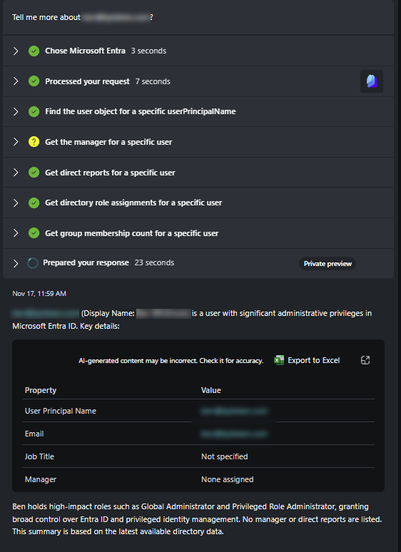 It becomes obvious pretty quickly that promptbooks aren’t just pulling from Intune. Most of them rely on data from other security services like Defender and Purview. I’m going to run a simple prompt book, Microsoft User Analysis.