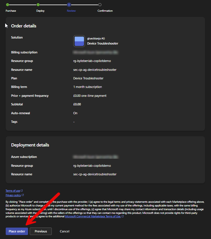 Review the order details and pricing. This agent is free but dont forget it will consume SCU’s when used. Click Place Order.