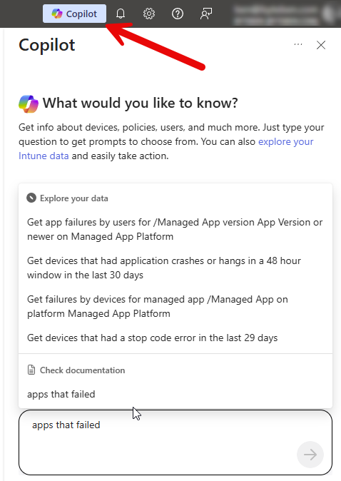 Think of Explorer as training wheels for querying Intune data. The pre-scripted prompts show you the kinds of questions you can ask, but you’re not limited to those templates. Now here’s the important bit that might not be obvious from the first screenshot. When you start typing in Explorer, you don’t get a completely open ChatGPT style experience where you can ask anything. Instead, Explorer shows you a dropdown of suggested prompts that match what you’re typing. In this example, typing “apps that failed” brings up pre-written queries like “Get devices that had application crashes or hangs in a 48 hour window in the last 30 days” or “Get failures by devices for managed app on platform.”