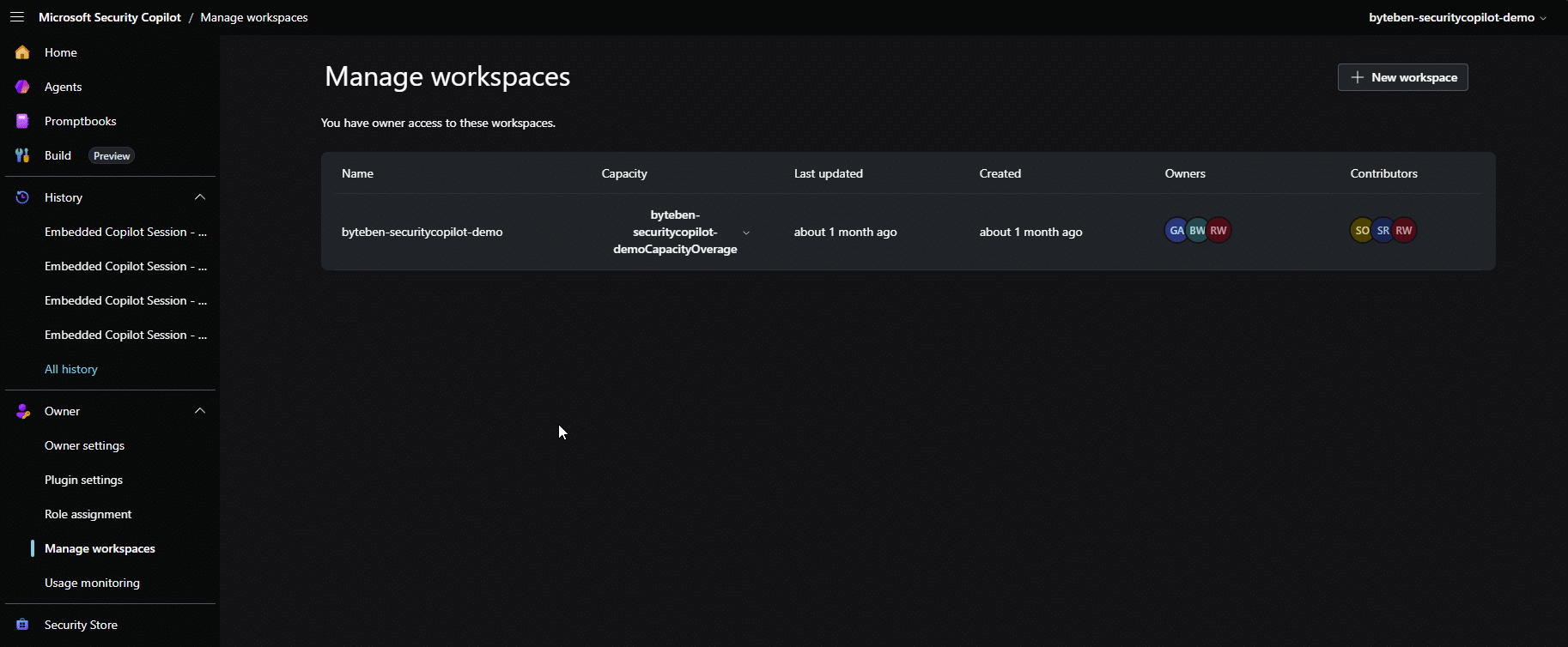 Before we look at the unicorns let loose after onboarding to Security Copilot, I want to focus on SCU provisioning a little more. When you finish onboarding, Security Copilot creates a workspace for you. This workspace is the logical home for everything Copilot does. It is where your settings live, where your plugins get added, where owners and contributors are managed, and where Copilot stores the context it needs for your prompts. The Security Capacity Azure resource that you created is assigned to this default workspace.