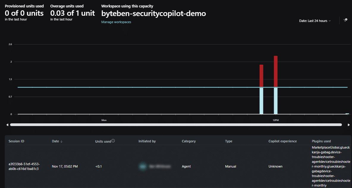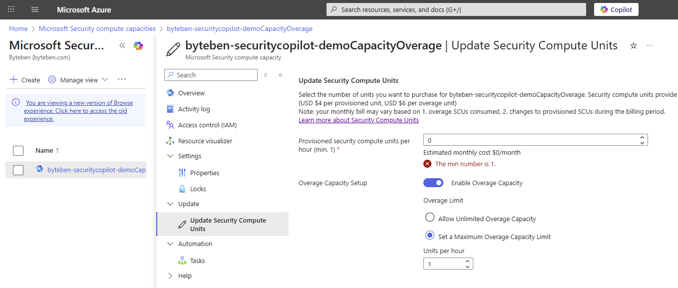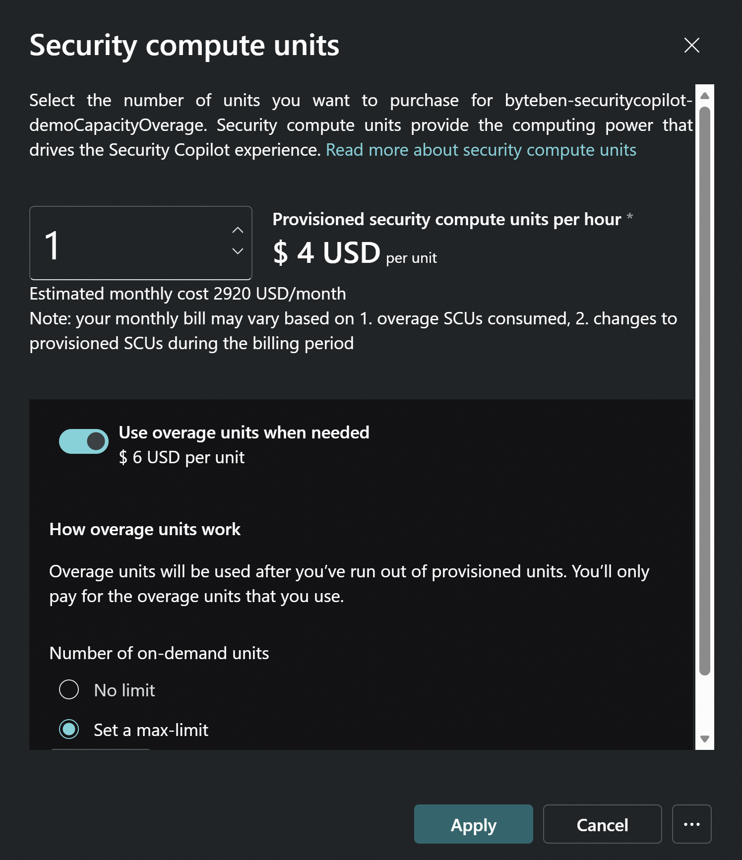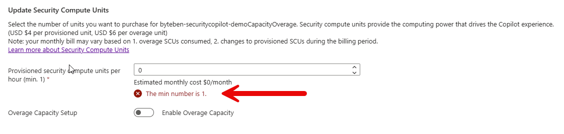 Even though the Azure portal forces you to enter a minimum of 1 SCU when you are editing the capacity there, the standalone Security Copilot portal actually lets you set your provisioned SCUs to 0 and run entirely on overage instead. This works more like a pay-as-you-go model. Overage costs more per hour, so you pay a higher rate when you use Copilot, but you avoid the fixed daily commitment of $96 (for 1 SCU). There are some limitations when you rely on overage only, and we will touch on those later.