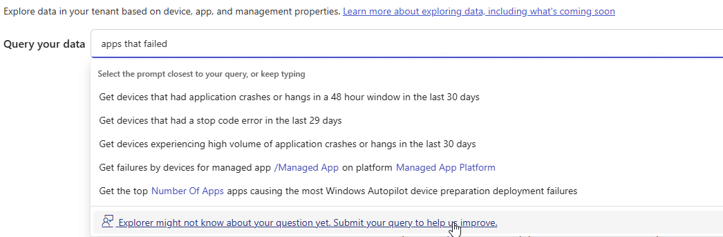 Think of Explorer as training wheels for querying Intune data. The pre-scripted prompts show you the kinds of questions you can ask, but you’re not limited to those templates. Now here’s the important bit that might not be obvious from the first screenshot. When you start typing in Explorer, you don’t get a completely open ChatGPT style experience where you can ask anything. Instead, Explorer shows you a dropdown of suggested prompts that match what you’re typing. In this example, typing “apps that failed” brings up pre-written queries like “Get devices that had application crashes or hangs in a 48 hour window in the last 30 days” or “Get failures by devices for managed app on platform.”