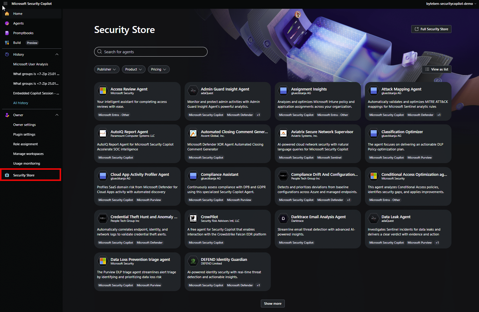 The Security Store is where you will find agents built by Microsoft, partners and community heros.
