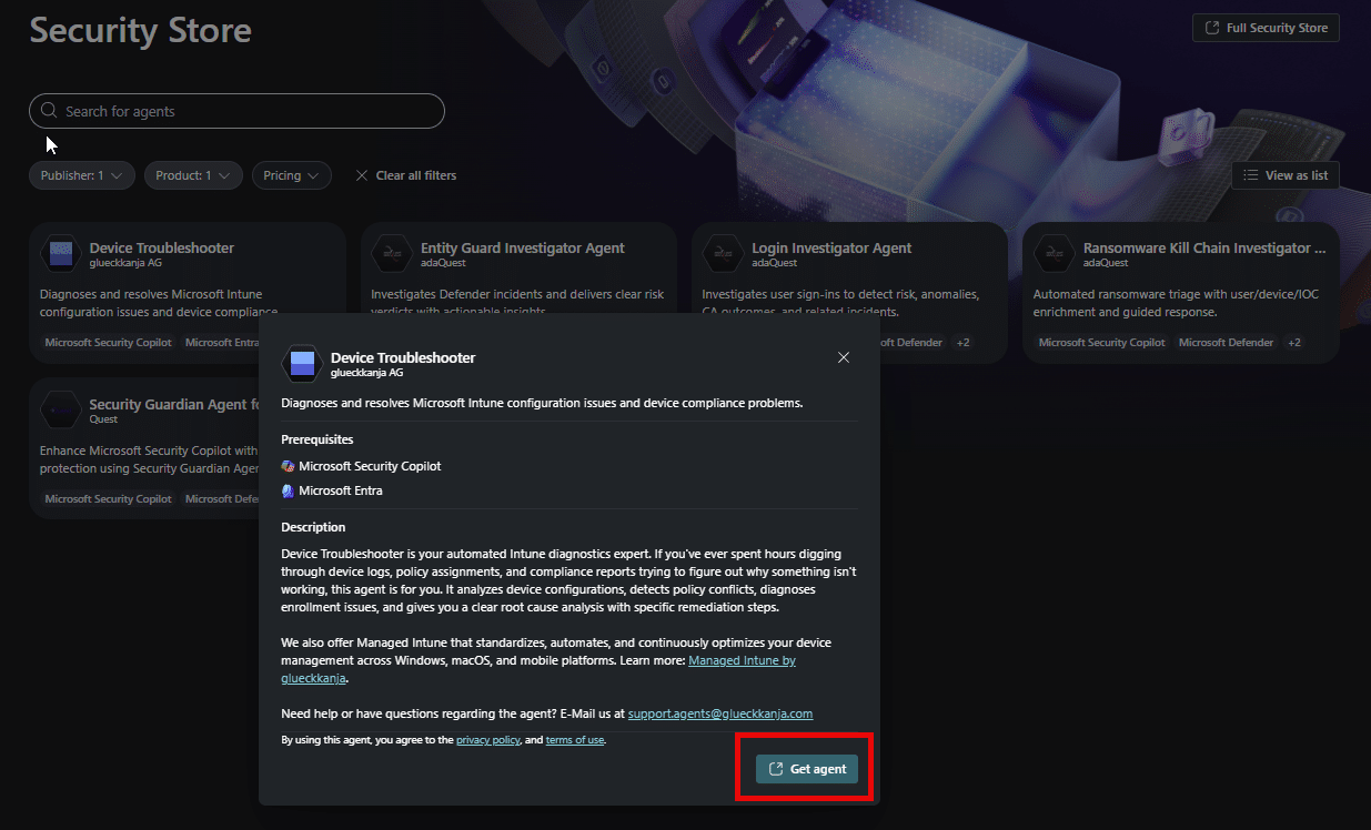 Clicking Get Agent will send you off to the Microsoft Security Store.