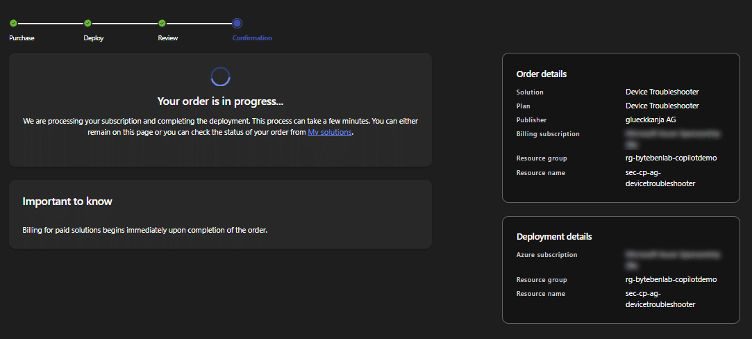 Review the order details and pricing. This agent is free but dont forget it will consume SCU’s when used. Click Place Order.