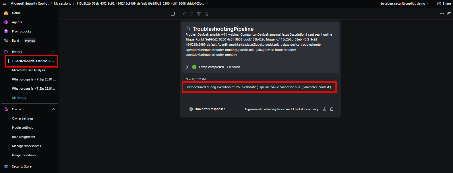 But thats OK, ill dig into that later. The point here was to show you how to find and run Agents that are being added to the Microsoft Security Store. Even though this agent run wasn’t succesful, it was insightful to see all the prompts it aws running through. Clearly alot of work goes into building an agent!