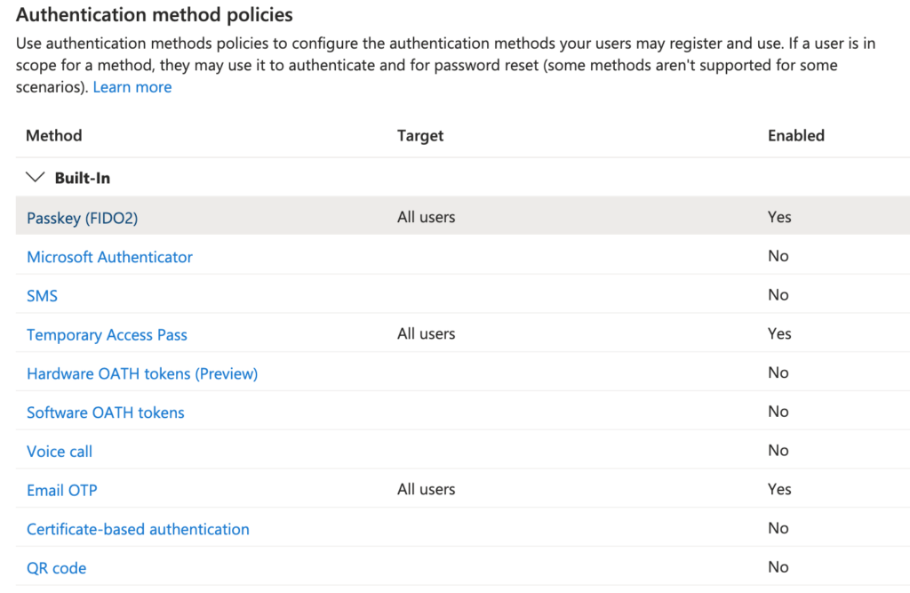 Since I like sharing my learnings: Here is how my tenant authentication methods policies blade looks. So it is possible just to have Passkeys as the only authentication and still be productive.