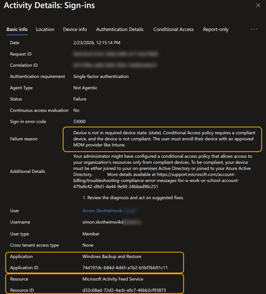Root Cause: Conditional Access Blocking “Windows Backup and Restore”