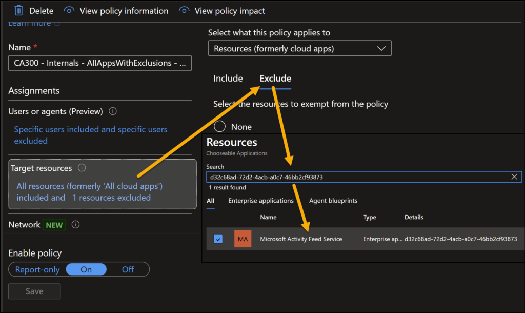 The solution was straightforward once identified: Exclude the “Microsoft Activity Feed Service” from the Conditional Access policy enforcing compliant devices.
